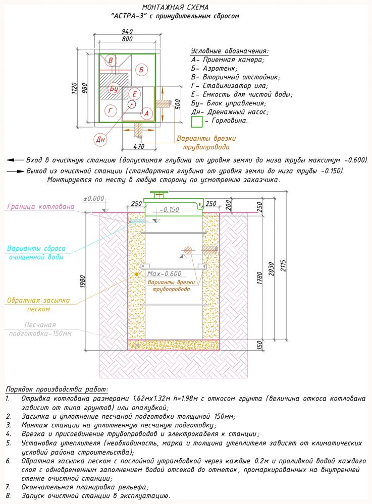 4. После выравнивания грунта септик астра 3пр подключается к системам воздухо- и энергоснабжения, осуществляется врезка сточной трубы.