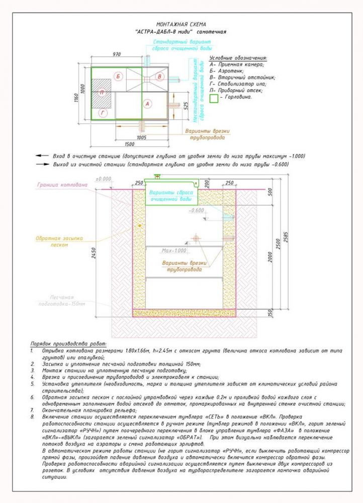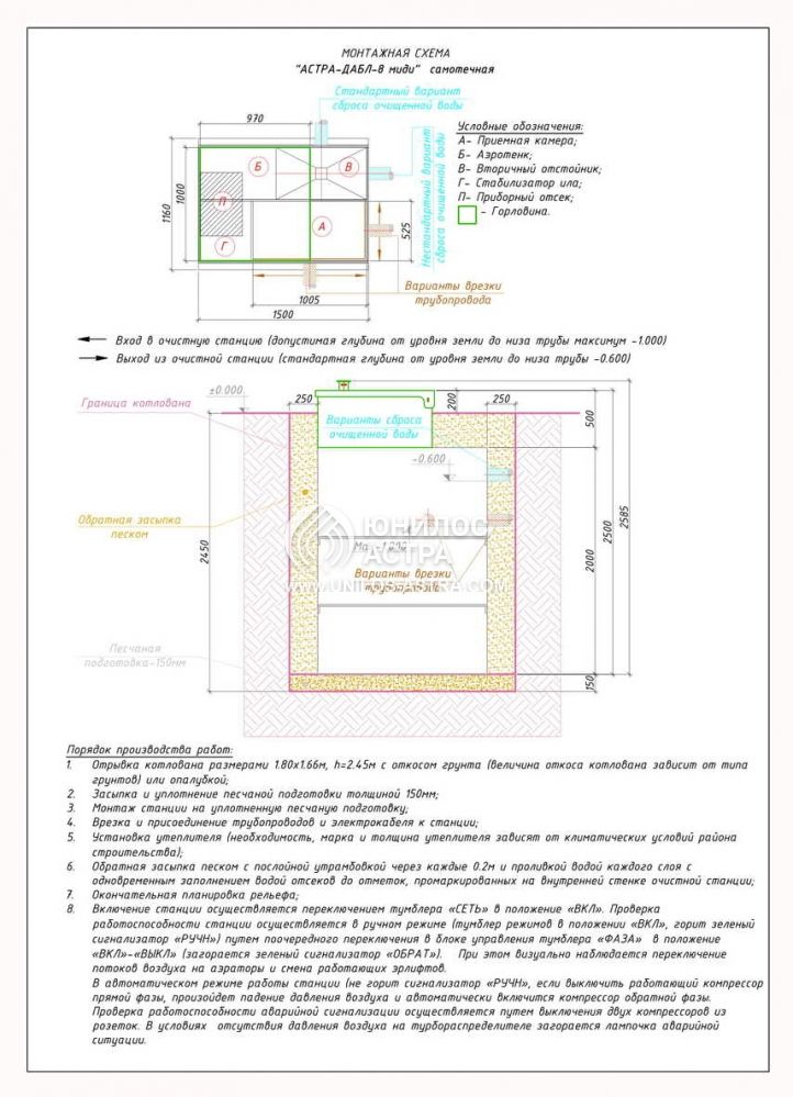 Установка септика ЮНИЛОС «АСТРА-8 миди» целесообразна при залегании входящей канализационной магистрали на глубине от 0,6 до 0,9 м.